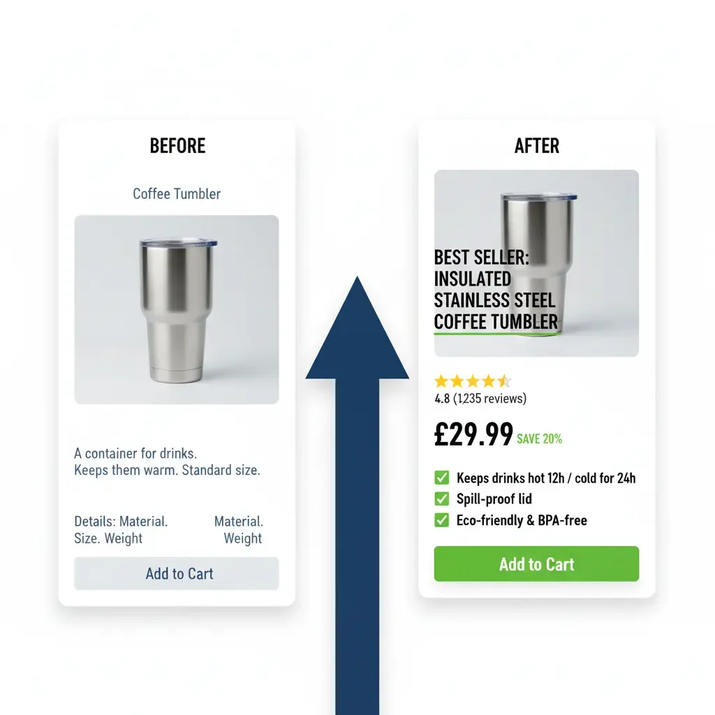 Dejamos de lado el SEO genérico para optimizar las 10-15 fichas de producto con mayor margen, reescribiendo títulos, descripciones y datos estructurados. Convertimos el tráfico existente en ventas, haciendo que cada clic se traduzca en más ingresos y reduciendo su dependencia de la publicidad de pago.